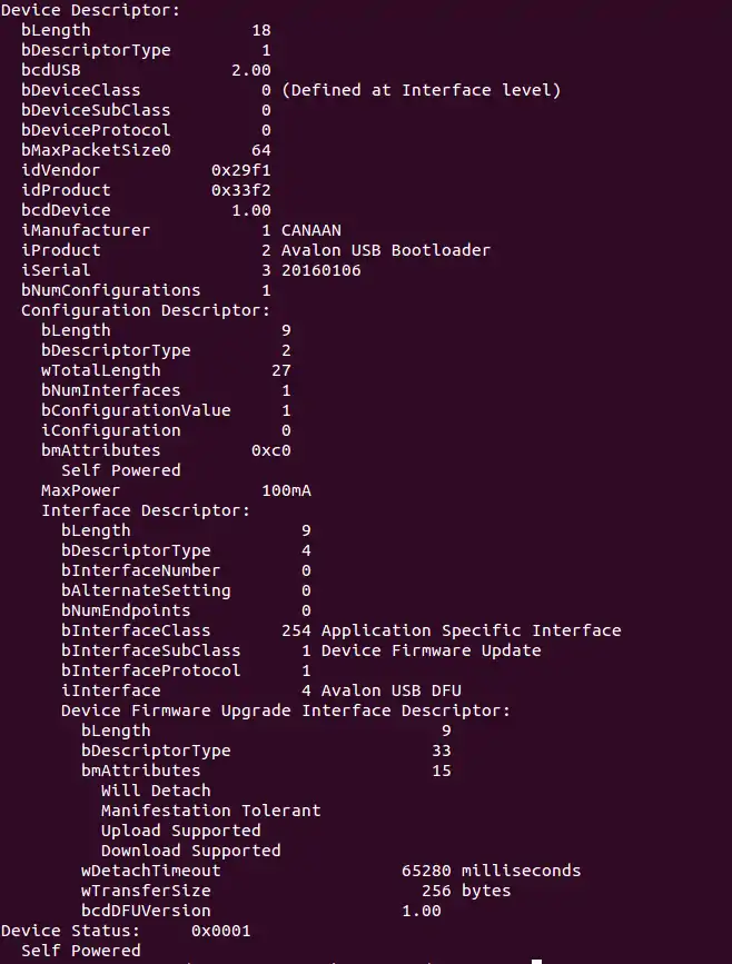 | 2 | bmAttributes | 1 | Bit mask | DFU attributes Bit 7……4: reserved Bit 3: device will perform a bus detach-attach sequence when it receives a DFU_DETACH request. The host must not issue a USB Reset. (bitWillDetach) 0 = no 1 = yes Bit 2: device is able to communicate via USB afeter Manifestation phase.(bitManifestationTolerant) 0 = no, must see bus reset 1 = yes Bit1: upload capable(bitCanUpload) 0 = no 1 = yes Bit0: download capable(bitCanDnload) 0 = no 1 = yes |