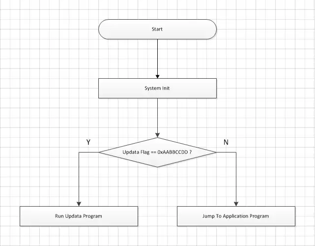 When the bootloader program run, first it judge the updata flag, if the updata falg is not equal 0xAABBCCDD, it will jump to application program. Otherwise it will run to updata program.