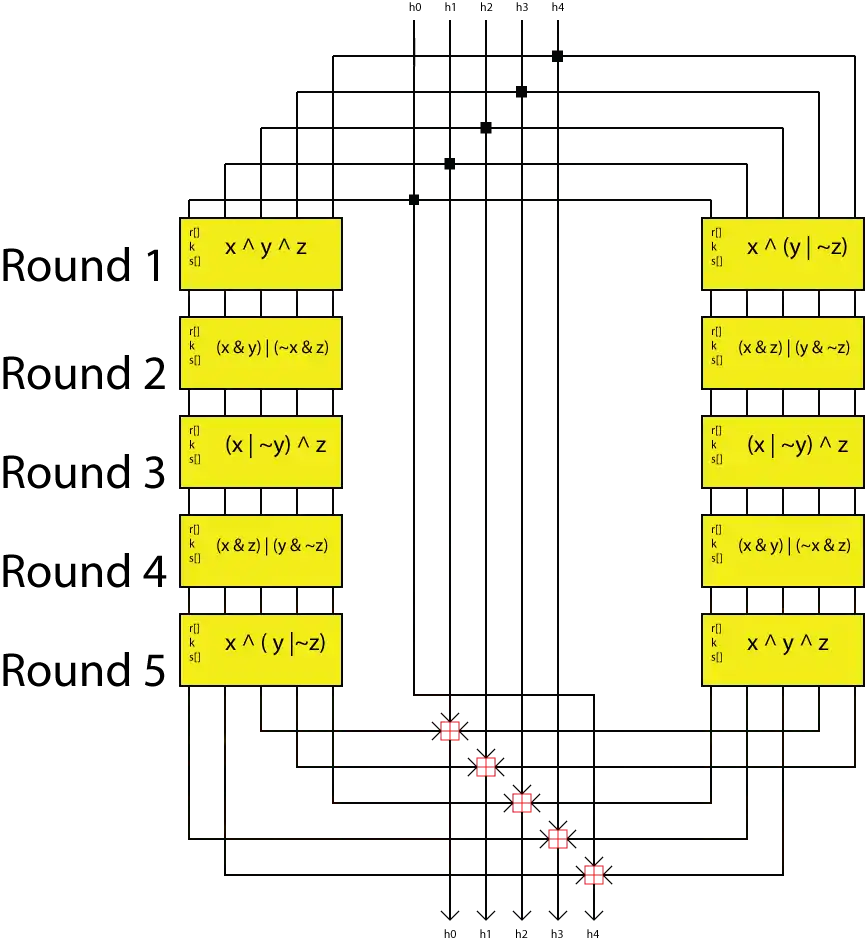 for(i := 0 to blocks - 1) { aLeft := h0 bLeft := h1 cLeft := h2 dLeft := h3 eLeft := h4 aRight := h0 bRight := h1 cRight := h2 dRight := h3 eRight := h4 for(int j := 0 to 79) { t := rotleft(s[j]) (aLeft + f(bLeft, cLeft, dLeft) + X[r[i]]) + eLeft aLeft := eLeft; eLeft := dLeft dLeft := rotleft(10) (c) cLeft := bLeft bLeft := t Do same for right } t := h1 + cLeft + dRight h1 := h2 + dLeft + eRight h2 := h3 + eLeft + aRight h3 := h4 + aLeft + bRight h4 := h0 + bLeft + cRight h0 := t }