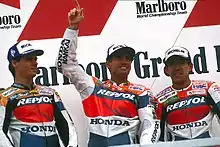 Initially he retired on the opening round in Malaysia and had only finished fourth in Indonesia whilst teammate Mick Doohan won the race. However, at the Japanese race, he took his first pole of the season on Saturday and finished second on Sunday.[13] In Spain however, he recorded his second retirement of the year. Initially taking the lead of the race from polesitter and teammate Doohan, as well as Luca Cadalora (who had a better start and thus led into turn one), Crivillé pulled a gap after a short battle with Cadalora, whose tyres began to fade. Crivillé then led for much of the race but Doohan was closing in at the final laps. On the last lap, spectators who already thought the race had ended, invaded the track around turn nine (the "Curva Àngel Nieto"), distracting Crivillé enough to allow Doohan to get back right on his tail going into the last couple of corners. Going into the last hairpin before the start-finish straight, Doohan went to the inside, going side-by-side with Crivillé. The pair did not touch, but Crivillé lost the rear whilst trying to accelerate, highsiding out of contention on the very last corner of the race, allowing Doohan to win the race as a result.[14][15][16]