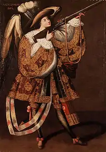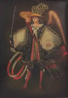An Ángel arcabucero (arquebusier angel) is an angel depicted with an arquebus (an early muzzle-loaded firearm) instead of the sword traditional for martial angels, dressed in clothing inspired by that of the Criollo and Andean nobles and aristocrats.[1] The style arose in Peru in the second half of 17th century[1] and was especially prevalent in the Cusco School.
