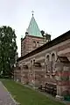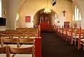 In the north wall by the tower a walled off entrance with a staircase presents a curiosity. In older churches there was typically a north and south entrance - men and women entrances - and in most churches the north entrance have later been walled off. The original medieval church also had two entrances and it is thought the architect Vilhelm Theodor Walther chose to emulate this by deliberately putting in a walled off entrance.[4]