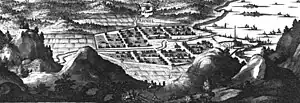 An engraving of a somewhat idealised view of Åmal in Suecia Antiqua et Hodierna, from 1708.
