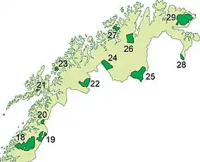 Ånderdalen National Park (Norwegian: Ånderdalen nasjonalpark) is located on the large island of Senja in Troms og Finnmark county, Norway. The 134-square-kilometre (52 sq mi) park lies within Senja Municipality. The park was established by royal decree on 6 February 1970 and it was enlarged in 2004. The national park preserves this Northern Norwegian coastal landscape. The bedrock consists of hard granite rocks and the landscape image gives exciting impressions of the glacial forces that have worked on Senja. The coastal pine forest in Ånderdalen has in some areas primeval forest with over 600 years old trees and countless marble pines and lower. Along the river there are many lush hawked birch forests and floodplain forests.[1]