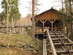 The conveyor in Asa (Kjerraten i Åsa) dates from 1807. It was a system to transport timber up a hillside. The conveyor consisted of 12 water wheels with a chain between. It had a vertical drop of 389 meters over a total length of 3900 meters. It took 3 hours to carry a timber through the conveyor, which had a capacity of approximately a log every sixth minute.[2]