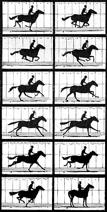 Marey studied other animals too. He published La Machine animale in 1873 (translated as "Animal Mechanism"). The English photographer Eadweard Muybridge carried out his "Photographic Investigation" in Palo Alto, California, to prove that Marey was right when he wrote that a galloping horse for a brief moment had all four hooves off the ground. Muybridge published his photos in 1879 and received some public attention.