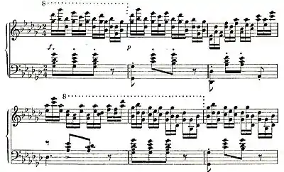 D♭ major is also the key of the middle section which is exactly twice as long as the A section. Its 32 bars though do not subdivide into four eight-bar periods but into sections of (4 + 2) + 4 + 2 + 4 + 8 + 8 bars with six motivically distinct modifications of the original semiquaver triplet figure, thus offering an attractive break from the symmetry.[7]: 106 An effective dynamic increase begins in bar 23 but does not end in a climax as the crescendo does not lead to fortissimo but eases off in diminuendos (bars 36 and 40).[7]: 107 Harmonically the section (bars 23–41) may be interpreted as an extended and ornamented D-flat major cadence.[7]: 107 Musicologist Hugo Leichtentritt (1874–1951) compares the left hand of bars 33–48 to horn signals.[7]: 108 These "announce" the recapitulation of the A part which begins as a literal restatement in bar 49, seems to approach a climax and eases off with a sudden delicatissimo pianissimo smorzando passage, leading via a cadence to the coda. The coda consists of two periods, the last one stretched by three bars.[7]: 109 The first one is a restatement of the middle section's opening transposed to the tonic G♭ major. The consequent of the second period contains a brilliantly swooshing, widely positioned arpeggio for both hands (bars 79(83) and is pianistically attractive. Its effect is based on the accent enforced by a third at the beginning of each triplet, as well as on the tenth and eleventh stretches of the left hand and the ascending bass line covering the entire range of the keyboard.[7]: 109 The piece ends with a rapid octave passage, ff and staccato, played by both hands on black keys, in a G♭ major pentatonic scale. Some prominent performers, including Horowitz and Rosenthal, choose to perform the final octave passage glissando.[8]