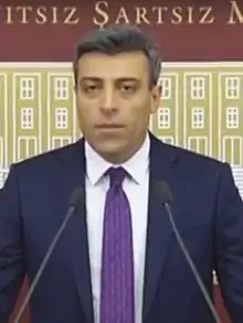Although he was appointed as the Ambassador to Tajikistan on 1 September 2015 after he was freed from ISIL, he resigned from this position two days later on 3 September to stand for Parliament in the upcoming November 2015 general election as a Republican People's Party (CHP) candidate. His party of choice came as a surprise to many commentators because of an image of Yılmaz hugging Prime Minister and Justice and Development Party (AKP) leader Ahmet Davutoğlu shortly after being released from captivity in 2014.[5] He was fielded as the CHP's top candidate in his hometown, the electoral district of Ardahan and was elected on 1 November 2015.[6] He has since criticised the Turkish government's decision to send troops to Mosul to train Kurdish fighters against ISIL, an incursion that had resulted in the souring of relations between Turkey and Iraq.[7][8] He became deputy chairman of the CHP. He is a prominent critic of the military operation Olive Branch in Afrin.[9] On January 25, he said the Free Syrian Army is in fact the al-Qaeda and Turkey should watch the origin of its allies.[9] This led to a wave of detentions of critics of the operation Olive Branch.[9]