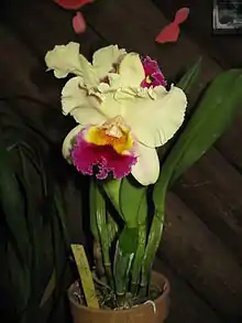 × Brassolaeliocattleya, abbreviated Blc. in the horticultural trade,[1] is the orchid nothogenus for intergeneric hybrid greges containing at least one ancestor species from each of the three ancestral genera Brassavola R.Br., Cattleya Lindl. and Laelia Lindl., and from no other genera.[2]