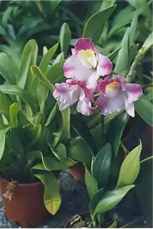 × Laeliocatonia is a nothogenus of intergeneric orchid hybrids descended from the parent genera Laelia, Cattleya and Broughtonia.[1] It is abbreviated Lctna. in the horticultural trade.[2]