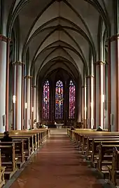 On 20 July 1941, Clemens August Graf von Galen, then bishop of Münster, delivered the second of his three famous sermons against the Nazi regime in the Überwasserkirche, titled "We are the anvil, not the hammer" ("Wir sind der Amboss, nicht der Hammer").[7] The church was badly damaged during bombings in World War II. Its restoration was completed in 1968, and it received a main organ in 1972. The windows were created by Valentin Peter Feuerstein. The church was closed for restoration again from 11 January 2016 until 11 November 2016.[8]