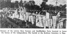 Banners of the Latvian New Farms and Smallholders Party lowered to honor the heroes of the Independence War buried at the Brethren Cemetery in Riga