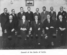 Central Board of the Latvian New Farms and Smallholders Party in Exile. From left to right K. Peterson, K. Migla, A. Blodnieks, A. Ozolins, A. Dzirkalis and K. Mantinieks