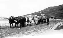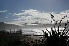 A jetty, the remains of which characterise the low tide landscape, would run out into the surf to lighters that would ferry passengers and valuable cargo to and from the freighters. Wool was loaded onto lighters by bullock train. Several ships have been lost in the Akitio bay, including the Peladies (1,020 tonne) in 1899,[3] parts of which can still be found at low tide or scattered around local historic landmarks. The beach remains a popular attraction for surfers and fishermen alike.