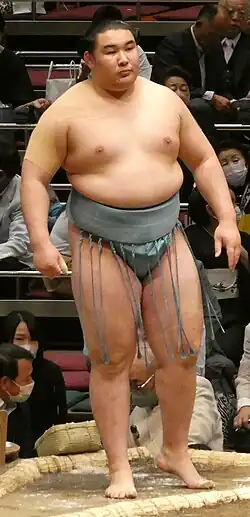 During his jūryō debut Ōshōma had to withdraw from Day 8 of the July 2022 tournament after a COVID outbreak at Naruto stable and in September he broke his thumb during his first match.[7] In November 2022, during his third tournament in jūryō, Ōshōma defeated Daiamami in a playoff on the final day to claim the jūryō championship.[2] In December of the same year, he injured his shoulders during a training session. He subsequently performed poorly for half of 2023, citing recurrences of pain as a factor in his lack of performance.[8] During his training, he often asked for advice from upper-division wrestler and makuuchi veteran Tamawashi, who's also from Mongolia.[8]