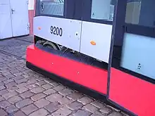 For a time the 15T was said to be the only 100% low floor tram in production with full-pivoting bogies . However, the Alstom Citadis X04, an experimental 100% low floor tram currently being developed with pivoting bogies (but with sections of high floor seating over the bogies), has made an initial production appearance in Istanbul as a modified Citadis 301 (with a fixed centre bogie), and as of 2015, a tram with a similar interior arrangement, and all pivoting bogies, is undergoing trials for Helsinki.[5] With the same length of tramcar, the Škoda 15T also has four bogies, compared to three (fixed) bogies (the same as on most 100% low floor trams) on it its predecessor, the Škoda 14 T's, which decreases the load each wheel puts on the track. Most of the tram floor is 350 mm (13.78 in) above the rails, but the height over the bogies is 450 mm (17.72 in) above the rails. The transition is inclined, without interior steps. The corridor above the central bogies is 700 mm (27.56 in) wide.[6]