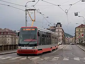 Škoda 15T (also known as Škoda ForCity Alfa) is a 100% low-floor multiple-unit tram developed by VUKV a.s. and built by Škoda Transportation in Pilsen for the Prague tram network. It was a successor to the Škoda 14 T, featuring articulated bogies and more power to correct for problems found during the operation of the 14 T. The 15T has articulated bogies at either end of the train, and Jacobs bogies between the segments. The tram has two double-doors in each segment (or four in bi-directional version) to allow fast boarding of passengers, and one extra side door leading to the driver's cabin.