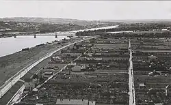 View from the tower on the developing Sajmište settlement. Old Railway Bridge, almost barren Banovo Brdo, Mala Ciganlija, Ada Ciganlija, and distant chimneys of the Čukarica sugar refinery are all visible