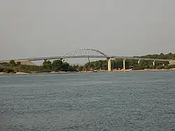 The Ždrelac Bridge (Croatian: Most Ždrelac) is a 210-metre (690 ft) through arch bridge carrying the D110 state road connecting islands of Ugljan and Pašman in Croatia. The original bridge was completed in 1972, however 2009 reconstruction increased the main span (replacing three spans with one) and widened the deck.[1][2]