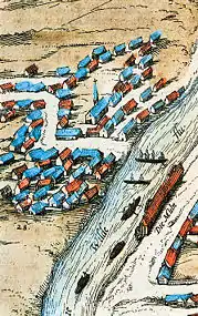Žirmūnai's southernmost section, which lies on the bank of the River Neris opposite the Vilnius Castle Complex, was part of the settlement known as Žvejai; another part of that settlement is now located within the elderate of Šnipiškės. According to archaeological surveys from 2005, a fishing village may have been located here as early as the late 14th century, giving the area its name, literally, Fishermen; it was later settled by craftsmen and housed the Orthodox Church of St Barbara.[2] During the 16th century, the only glass factory in the Grand Duchy of Lithuania was located in the suburb of Žvejai.[14] In 1563, after the construction of the first bridge over the River Neris (at the approximate location of today's Mindaugas Bridge), the suburb of Žvejai became an integral part of the city of Vilnius.[14] During Tsarist rule in the 19th century, the name of Žvejai was superseded by that of Piramont, originating from the small estate of Piramont in the area (now Kalvarijų 1).[15] Piramontskij Alley can be seen in a 1904 map of Vilnius[16] where today's A. Juozapavičiaus Street in the elderate of Šnipiškės is located, close to the boundary of Žirmūnai. The usage of Piramont as a placename gradually became limited to the southern part of Žvejai.