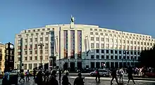 In the late 19th century, ZIBA erected a new head office on the prestigious Na příkopě thoroughfare of Prague, designed by Osvald Polívka and completed in 1900. In the 1930s, it tore it down and from 1935 to 1942 built a much expanded headquarters designed by architect František Roith, who reused the allegoric sculpture that had crowned Polívka's building. The complex was taken over by the State Bank of Czechoslovakia after it absorbed ZIBA in 1950, and has remained the central office of the Czech National Bank after 1992. It was comprehensively renovated in 1997-2000.[10]