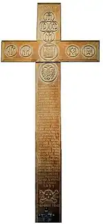 On 1 September, Șerban ordered his soldiers to make a three-meter oak cross in the Gatterhölzel forest, near Schönbrunn, close to his tent. A few days before the end of the siege, he ordered his troops to bury the cross and ordered a prisoner, whom he released from the Tatars, that after the Ottomans left, he needs to go and tell Archbishop Kollonitsch to dig up the cross and raise it to a proper place where it may be daily honored by the people of Vienna. After the siege, the cross was found, transported to the city and installed inside a chapel on the spot where it was first erected.[8] In 1961, the chapel was restored and now houses a miniature copy of the cross.[9] The text on the cross reads: