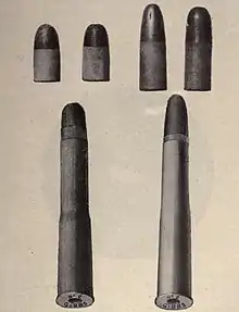 ![]() .461 No 2 Gibbs cartridges, 360 grain cartridge and bullets on the left, 570 grain cartridge and bullets on the right. | ||||||||||||