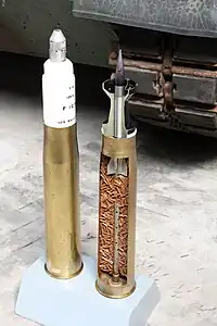 A 105 mm DM16 illuminating round alongside a 105 mm DM23 APFSDS round (cross-sectioned).