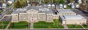 The building's main entrance is at the center of the facade, with a sidewalk leading up to it, as well as stone steps with a stone rail near the door.[1]