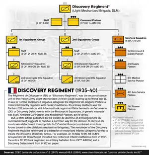 The organization of the Régiment de découverte (DLM) during the Battle of France. - Summer 1940 : Regiment preserved within the framework of the Armée d'Armistice, as a garrison force at Orange