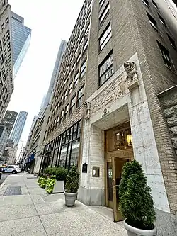 Atlantic Terra Cotta made the architectural terracotta on the building.[4] The building's design includes elements inspired by Middle Eastern architecture, such as ziggurats.[10][11] There are setbacks above the 10th, 14th, and 17th stories, each of which are highlighted with two-colored terracotta friezes.[10] These setbacks were required by the 1916 Zoning Resolution.[11] The architectural historian Christopher Gray wrote of the building in 2004: "The ornamental program of Assyrian reliefs in polychrome terra cotta makes it one of the brightest spots in the area."[7]