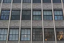 There is a terracotta frieze above each setback, which is divided into panels.[11][16][17] Each panel contains winged lions with alternating motifs of horses' and humans' heads.[16] The winged lions have also been characterized as Hittite griffins and sphinxes.[11][17] The panels are separated from each other by palm trees and are surrounded by zigzag designs. The friezes above the 10th, 11th, 14th, 15th, and 17th stories wrap around to the western and eastern elevations.[16] The panels at the corners are decorated with motifs of the Mesopotamian devil Lamashtu.[11][18] The panels at the 14th-story setback are surrounded by metal frames and separated vertically by gargoyles. The central panels at the 17th-story setback are surrounded by metal frames. A terracotta cornice runs above the top of the building.[16] The cornices and friezes helped distinguish the building from its surroundings.[19]