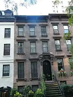 The house contains three stories and a high basement.[12][13] The building's front façade is faced with brownstone and is divided vertically into three bays, with three windows on the second and third floors and two windows and an entrance on the first floor and the basement. On the basement level, the façade has large rusticated blocks with two windows set behind iron grilles and a secondary entrance below the stoop. The stone stoop is flanked by metal railings and leads up to the primary entrance on the first floor, which is a wood paneled double door in an arched opening topped with paneled spandrels, an ornamental keystone, and brackets decorated in floral patterns that support a segmental pediment. The windows on the first floor next to the primary entrance have molded lintels and footed sills. On the second and third floors, the windows have similar designs, except that the console brackets supporting the sills are smaller in size and less ornate. A cornice runs above the third floor and is supported by four console brackets with paneling in between.[12] The interior of the house includes marble fireplaces, Italianate molding, and a wooden staircase with banister that is topped by a skylight on the third floor.[14]