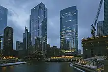150 North Riverside Plaza is a highrise building in Chicago, Illinois, completed in 2017 and anchored by William Blair and Co. The building is 54 stories tall. The building occupies a two-acre site on the west bank of the Chicago River, whose size and location demanded an unusually small base for the building. The building features 1.2 million square feet (110,000 m2) of leasable office space. Due to its unique superstructure design, it encompasses just 25 percent of the lot. In 2019, the building was given the Chicago Chapter of the American Institute of Architects' highest award for design excellence.[4]