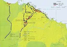 The 163rd Regimental Combat Team was attached to Major General George Alan Vasey's 7th Division and Doe assumed command of the Sanananda Front from Brigadier Ivan Dougherty on 3 January 1943.[3]: 330 The front line consisted of a raised road with Japanese positions on relatively dry ground astride it, surrounded by jungle swamp. Roadblocks had been established behind the Japanese positions but they had not been budged; both sides resupplied their positions through the swamp. Vasey's plan was for the Americans to fix the Japanese in position while he attacked with Brigadier George Wootten's 18th Infantry Brigade, supported by M3 Stuart light tanks of the 2/6th Armoured Regiment and 25 pounders of the 2/1st Field Regiment.[3]: 332