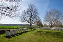 A memorial dedicated to 177th Tunnelling Company and its activities is RE Grave, Railway Wood, maintained by the Commonwealth War Graves Commission (CWGC). It is located in the former Ypres Salient, on the Bellewaerde Ridge near Zillebeke, about 4 kilometres east of Ypres. The memorial marks the site where twelve soldiers (eight Royal Engineers of the 177th Tunnelling Company and four attached infantrymen) were killed between November 1915 and August 1917 whilst tunnelling under the hill near Hooge during the defence of Ypres. The men were trapped underground and their bodies not recovered, and after the war, the memorial was erected on the hill.[16][17]