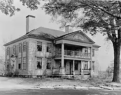 The structure stands two stories tall beneath a hip roof, seven bays wide and four bays deep. It is of frame construction covered with clapboard, except at the front where it is imitation ashlar; wood quoins ornament its corners. A two tier Doric porch projects from the front facade, with single-story Tuscan pillars supporting the porch, and two-story Doric pillars at the corners. The upper level has a balustrade with Chinese railings. The two sides and rear also contain entrances, and the rear facade was once graced with a large Palladian window. (As of 2005, the rear facade seems to have been obliterated in a large-scale extension to the building.) There are two interior end chimneys.