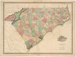 Throughout North Carolina, the 1827 hurricane was considered more severe than a similar-tracked cyclone that impacted the region 12 years prior. In the city of Wilmington, a few buildings saw their chimneys destroyed, roofs ripped off, and fences flattened.[4] One resident recounted that waves washed above garden fences up to 1.3 miles (2.1 km) inland,[1] while other reports suggested that storm tides surpassed 10 feet (3.0 m) above normal levels.[6] Less than a dozen vessels were driven ashore along the banks of the Cape Fear River. Outside the city, the hurricane widened the Masonboro Sound by at least 0.5 miles (0.80 km) and destroyed several of the accompanied saltworks. Fayetteville recorded a 30-hour period of gales and rain,[7] where an abundant corn crop sustained insignificant loss. The cotton and tobacco crops did not fare so well, and many roads were rendered impassible by fallen trees or high water.[8] Raleigh, meanwhile, saw many of its water courses flooded, mills and bridges carried off, and trees and chimneys downed. Corn and cotton crops were in some cases torn to pieces, and piles of wheat which had been stacked in fields were swept downstream.[9] In Bethabara, or modern-day Winston-Salem, the hurricane's onslaught downed fences, tore off roofs, and damaged orchards and forests. Several bridges were swept away by floodwaters, and numerous washed-out roadways impeded travel for weeks following the storm's passage.[4] In Washington, floodwaters rose to as much as 6 feet (1.8 m) in the first floor of houses along Water Street,[7] while storm tides exceeded 12–15 feet (3.7–4.6 m).[6] One schooner was driven aground causing damage to a wharf while several others combined to dislodge and carry away a bridge. Most crops were destroyed.[4] In nearby New Bern, residents were forced to navigate the city by canoe.[7]