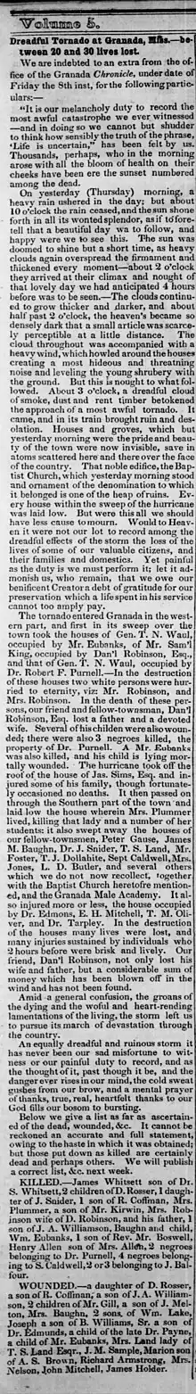 The major source on the tornado is a news account from the Grenada Chronicle that was published the day after the tornado and widely reprinted. "Dreadful Tornado at Granada, Miss.—between 20 and 30 lives lost." (The Guard, Holly Springs, Miss., May 15, 1846)