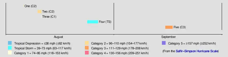 Of the season's five tropical cyclones, four reached hurricane status. Furthermore, one of those four strengthened into a major hurricane, which are Category 3 or higher on the modern-day Saffir–Simpson hurricane wind scale. The strongest cyclone of the season, Hurricane Five, peaked at Category 3 strength with 125 mph (200 km/h) winds. It brought only minor impact to Louisiana and Mississippi. The first storm of the season brought locally severe impact to Tampico, Tamaulipas, Mexico in early August. Tropical Storm Four caused severe damage in the Lesser Antilles.
