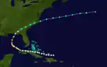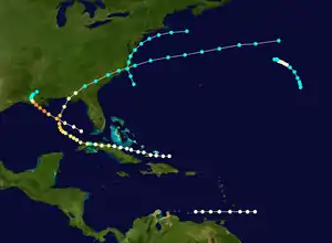 A hurricane formed north of Hispaniola on August 25. It moved westward, passing over the Inagua Islands before striking the north coast of Cuba as a Category 2 hurricane on August 27. The cyclone weakened to Category 1 strength as it crossed the island, close to Matanzas, but regained first Category 2 and then Category 3 strength as it moved north through the Gulf of Mexico. The cyclone made landfall near Panama City, Florida, on August 31 as a Category 2 hurricane. Thereafter, it then quickly weakened to a tropical storm while moving northward through Georgia and South Carolina. The storm entered the Atlantic from the state of Virginia on next day and dissipated on September 3.[2]