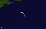 A sixth tropical storm was first observed by the brig Caroline E. Kelly on September 18, which experienced a heavy gale while located about 930 miles (1,500 km) east-southeast of Bermuda.[1] With initial winds of 60 mph (97 km/h), the storm slowly strengthened while moving north-northwestward. At 1200 UTC on September 19, it reached hurricane status and peaked with winds of 80 mph (130 km/h). The storm decelerated and remained at this intensity for over 24 hours. Late on September 21, the system re-curved westward and weakened to a tropical storm.[2] It was last seen by the Pride of the Sea on September 22,[1] while located about 695 miles (1,118 km) south of Cape Race, Newfoundland.[2]