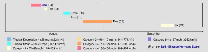 The 1856 Atlantic hurricane season featured six tropical cyclones, five of which made landfall. The first system, Hurricane One, was first observed in the Gulf of Mexico on August 9. The final storm, Hurricane Six, was last observed on September 22. These dates fall within the period with the most tropical cyclone activity in the Atlantic. Only two tropical cyclones during the season existed simultaneously. One of the cyclones has only a single known point in its track due to a sparsity of data. Operationally, another tropical cyclone was believed to have existed in the Wilmington, North Carolina area in September,[1] but HURDAT the official Atlantic hurricane database excludes this system. Another tropical cyclone that existed over the Northeastern United States in mid-August was later added to HURDAT.[2]