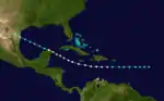 The final tropical cyclone was first observed at 0000 UTC on September 24, while located about 420 miles (680 km) east of Guadeloupe. Initially a tropical storm, it strengthened slightly before crossing the Leeward Islands on September 25.[5] In Guadeloupe, several ships at the port in Basseterre were swept out to sea.[3] Continuing eastward, the storm soon entered the Caribbean Sea. Early on September 26, the system strengthened into a hurricane.[5] By September 28, it was west of the Cayman Islands and had reached Category 2 strength. The storm weakened to a tropical storm after passing Cancún early on September 29 and impacted the Gulf coastline, near the United StatesMexico border, at that strength the next day before dissipating.[5] At Port Isabel, Texas, several hundred homes were swept away, and several towns near the mouth of the Rio Grande also sustained damage.[11]