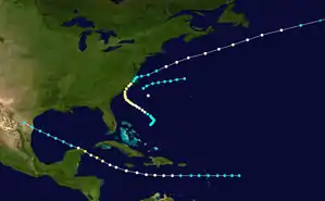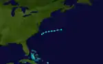 The ship Star of the South experienced heavy gales offshore the East Coast of the United States on June 30.[3] HURDAT lists the first tropical cyclone of the season beginning at 0000 UTC, while located about 100 miles (160 km) southeast of Cape Hatteras, North Carolina.[5] The storm moved slightly north of due east with winds of 60 mph (95 km/h).[5] It was last noted about 265 miles (425 km) north-northwest of Bermuda by the bark Virginia late on July 1.[3][5]