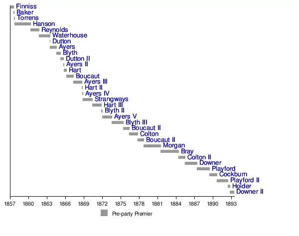 John DownerFrederick HolderThomas Playford IIJohn Cockburn (Australian politician)Thomas Playford IIJohn DownerJohn Colton (politician)John Cox BrayWilliam Morgan (Australian politician)James BoucautJohn Colton (politician)James BoucautArthur BlythHenry AyersArthur BlythJohn Hart (South Australian colonist)Henry StrangwaysHenry AyersJohn Hart (South Australian colonist)Henry AyersJames BoucautJohn Hart (South Australian colonist)Henry AyersFrancis DuttonArthur BlythHenry AyersFrancis DuttonGeorge Marsden WaterhouseThomas Reynolds (Australian politician)Richard Hanson (Australian politician)Robert TorrensJohn Baker (Australian politician)B.T. Finniss