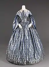 By the early 1860s, skirts had reached their ultimate width. After about 1862 the silhouette of the crinoline changed and rather than being bell-shaped it was now flatter at the front and projected out more behind.[4] This large area was largely occupied by all manner of decoration. Puffs and strips could cover much of the skirt. There could be so many flounces that the material of the skirt itself was hardly visible. Lace again became popular and was used all over the dress. Any part of the dress could also be embroidered in silver or gold. This massive construct of a dress required gauze lining to stiffen it, as well as multiple starched petticoats. Even the clothes women would ride horses in received these sorts of embellishments.[5]