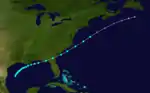The first known tropical cyclone of the season was observed on September 3, about halfway between the Bahamas and Bermuda.[1] A nearby ship estimated winds of 80 mph (130 km), indicating the presence of the hurricane.[4] It moved northward initially, passing about 220 mi (350 km) west of Bermuda on September 4. Thereafter, the hurricane turned toward the northeast,[1] and the ship "John Richardson" encountered gale force winds on September 5, resulting in a wreck of its cargo.[2] On September 6, it was estimated to have reached peak winds of 105 mph (169 km/h), based on observations from the ship with the call sign "Greenock".[4] The hurricane lashed the ship with strong winds for 14 hours, killing the captain and one crewman. At the time, it was about 400 mi (640 km) southeast of Halifax, Nova Scotia.[2] Turning to the northeast, the hurricane passed south of Newfoundland before last being observed on September 7.[1]