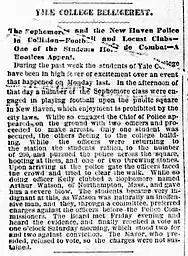 Other schools, such as Yale[6] and Harvard,[7] banned the game outright. On 31 October, a Yale student was arrested after a group of sophomores were caught playing football on New Haven Green.[8] Following the arrest, a group of 200 students gathered outside the police station and one student, Arthur Watson, was seriously injured after being clubbed over the head by a policeman (Officer Kelly). A committee of students complained to the Police Commissioners who split 2–2 (the Mayor abstained) on bringing charges against the officers.[9]