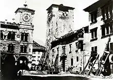 In the most stricken zones, a third of the buildings were damaged. In Belluno itself, the duomo's apse collapsed. Eight buildings were completely destroyed, another 110 later had to be demolished, 139 needed restoration, and 251 were in need of some work. One church was destroyed, and other seven were damaged. In the city's outskirts, two blocks had to be demolished, 21 houses needed restoration and 219 more received slight damage. No building in the city was left undamaged.[2]